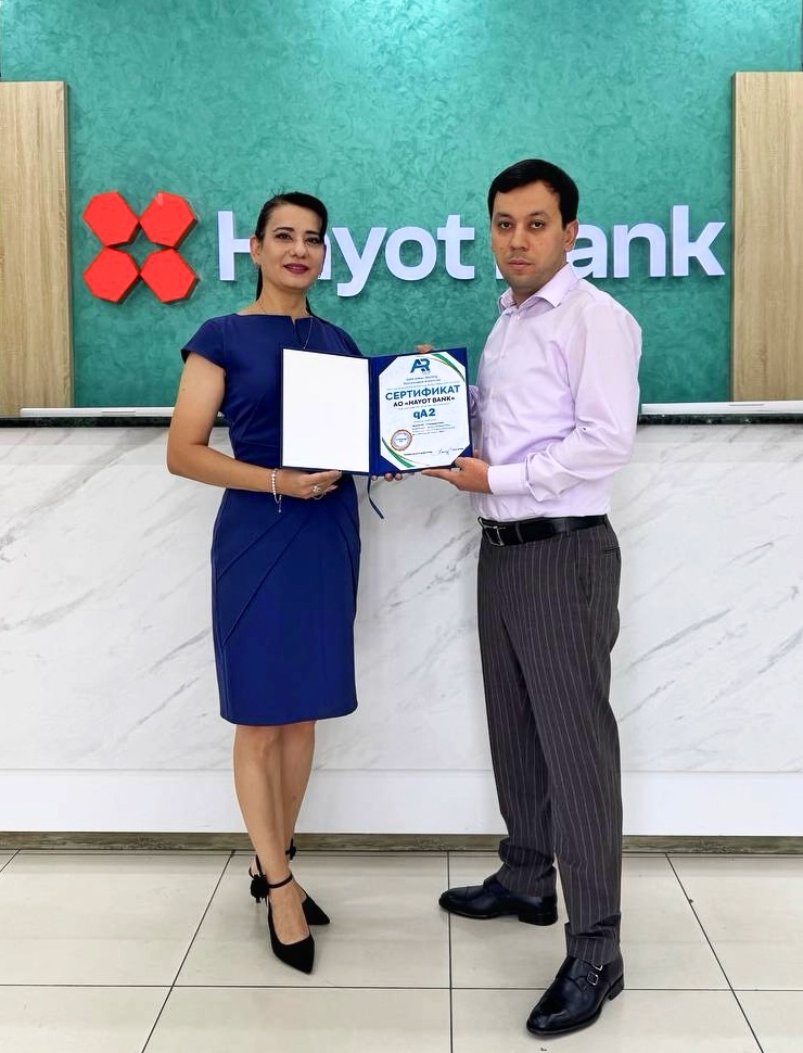 На основании анализа процесса взаимодействия с корпоративными клиентами, а также результатов анкетирования, проведённого среди клиентов банка, агентство OOO «Ahbor-Reyting» на основе оценки качества предоставляемых услуг, а также индексов NPS и CSI, присвоило АО «HAYOT BANK» рейтинг qA2, что соответствует высокому стандарту качества обслуживания.