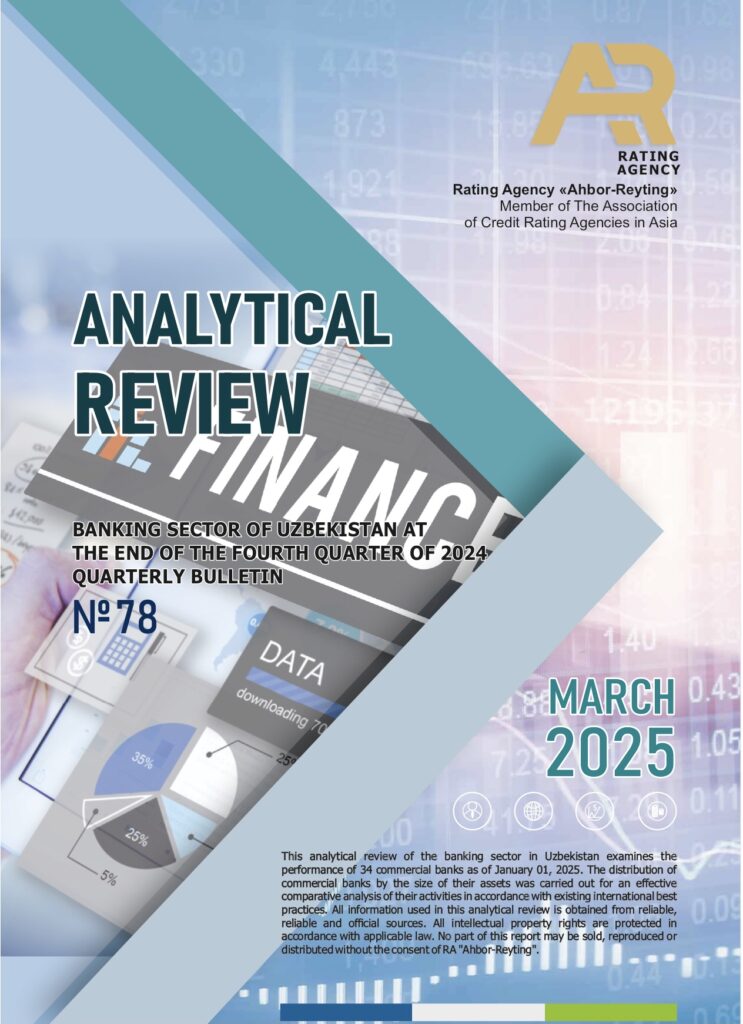 ООО «Ahbor-reyting» представляет Вашему вниманию очередной 78 номер ежеквартального бюллетеня – Аналитический обзор банковского сектора Узбекистана по итогам IV квартала 2024 года, который является эксклюзивным продуктом рейтингового агентства ООО “Ahbor-Reyting” и основывается на специально разработанной методике и содержит комплексный анализ банковского сектора Республики Узбекистан, как в целом, так и непосредственно в разрезе банков с разбивкой по группам в зависимости от размеров банковских активов.